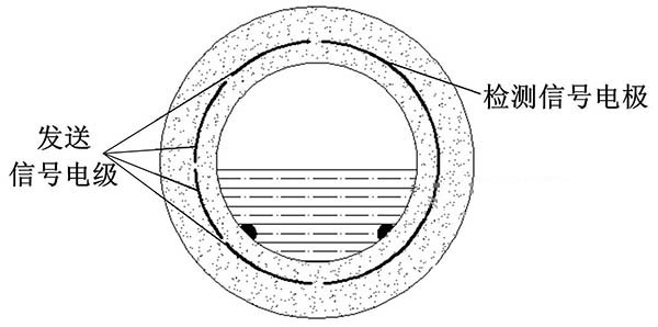 ③利用阻抗或信號衰減研制的非滿管管道式電磁流量計。這種結(jié)構(gòu)的非滿管管道式電磁流量計是當前國內(nèi)研究的方向之一。其結(jié)構(gòu)是流量管底部貼一對信號發(fā)射電極,在流量管中間貼信號接收電極。由于信號在流體中傳播會產(chǎn)生衰減,且傳播時間越長,衰減越多,因此通過信號接收電極接收到的信號衰減量即可得知液面高度;同時該電極還能測量流體切割磁感線產(chǎn)生的電動勢,以此達到測量非滿管流量的目的。阻抗式或信號衰減非滿管管道式電磁流量計結(jié)構(gòu)簡圖如圖5所示。